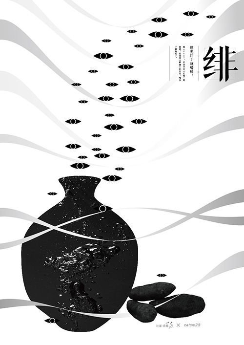 Chinese ink wash painting, or sumi-e, is characterized by its minimalist approach, relying on varying shades of black ink to create a spectrum of tones, textures, and moods. This particular poster design masterfully utilizes this technique, featuring a striking black vase-like form at its base, rendered with a textured, almost organic feel. Above it, a cascade of stylized ‘eyes’ or perhaps abstract forms, rendered in crisp black, ascends amidst flowing white ribbons, creating a dynamic yet harmonious composition. The overall effect is one of mystery, introspection, and artistic flair.
