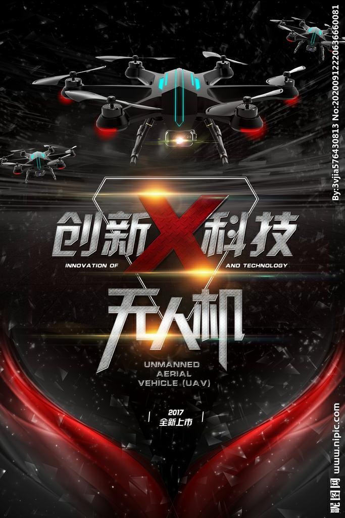 The typography is strong, modern, and impactful. The Chinese characters, translated to ‘Innovation and Technology’ and ‘Unmanned Aerial Vehicle (UAV)’, are rendered in a metallic, three-dimensional style, giving them weight and importance. The English subtitles reinforce the message, ensuring clarity for a global audience. The use of a prominent ‘X’ symbol adds a touch of edginess and modernity, often associated with cutting-edge projects or next-generation technology.