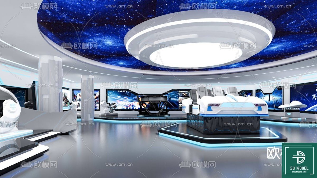 This particular 3D model stands out due to its comprehensive detailing and modern aesthetic. The image showcases a futuristic exhibition hall, characterized by its sleek lines, expansive open spaces, and sophisticated lighting. The ceiling features a captivating starry night sky motif, adding a touch of wonder and grandeur to the environment. The central area highlights a futuristic vehicle on a display platform, surrounded by interactive screens and minimalist architectural elements.