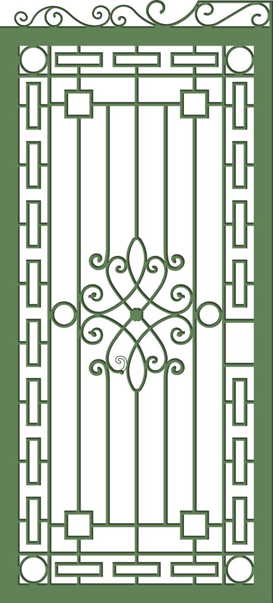 - Design Elements: The design features a strong vertical orientation, typical of a gate or door panel. It incorporates a symmetrical layout with a central decorative element. The outer frame is composed of repeating rectangular modules, giving it a sturdy and classic appearance. The inner section showcases elegant vertical bars interspersed with a beautiful, ornate scroll design at its heart, reminiscent of traditional ironwork. The subtle green outline against a dark background in the preview image suggests a potential for customization in terms of color and texture.